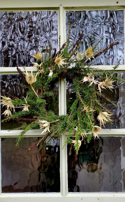 Merry Christmas ? &Happy 2025 !今年のリースは、嵐で折れたレバノン杉の枝をリサクル。エリンジウム、オノクレア センシビリス(コウヤワラビ)のシ···